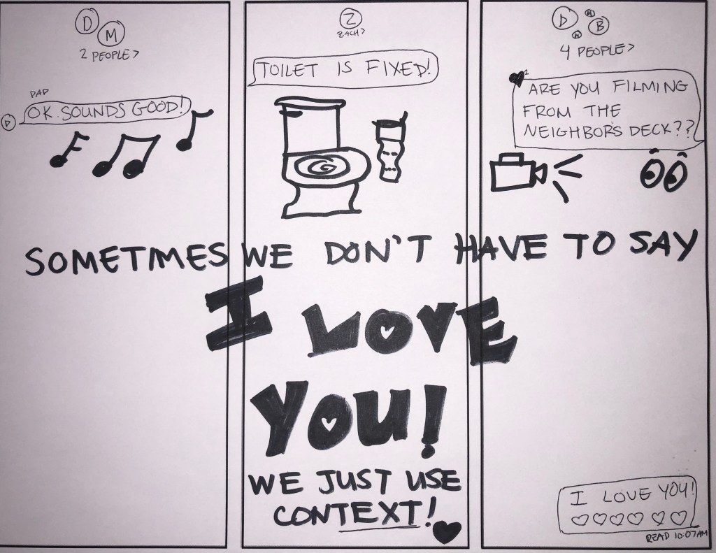 1. I love this! The little details in your drawing (like the number of people in the group text) are delightful, as is the idea that those little texts about all sorts of mundane things are ways to say “I love you”! I texted two friends today that I hadn’t texted in awhile, and it was such a lift to my soul.